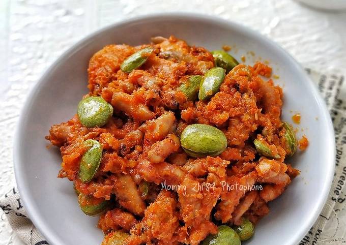 - Masak hingga air menyusut, tambahkan cumi dan pete.